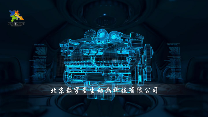 (1)发动机动画的开头需要设计一个高科技感觉的镜头,于是动画师将发动机模型采用蓝色线框的形式来展示,让发动机看着像是蓝色线条做成的一样,两侧加上滚动的英文字母,加上光效和生效,使画面给人一种科技蓝的感觉,使整个动画画面高档大气。