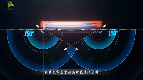 轨道监控小车是由公司专业的3d建模师根据客户提供的图纸参数来建模的,精确的还原了监控小车的内部结构和外观。此处的动画画面展示的就是轨道监控小车的外观,我们从画面上可以看到小车横放在画面的中央,两端的摄像头使用白色箭头画出一个150度的半圆弧度,表示摄像头的采集范围在150度以内。