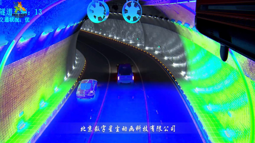 (6)为了展示智能监控小车在隧道内的监测过程,动画师采用了蓝色配绿色来模拟摄像头扫描隧道的过程,因为摄像头工作的时候,我们肉眼是看不到他的扫描过程的,只能使用3d动画还原技术将摄像头的扫描过程模拟出来,监控小车沿着隧道慢慢形式,一道蓝绿色的光幕同时扫过整个隧道,扫过的道路,汽车,通风设备都会一起变颜色,从而生动形象的展示了监控小车的监控扫描过程。